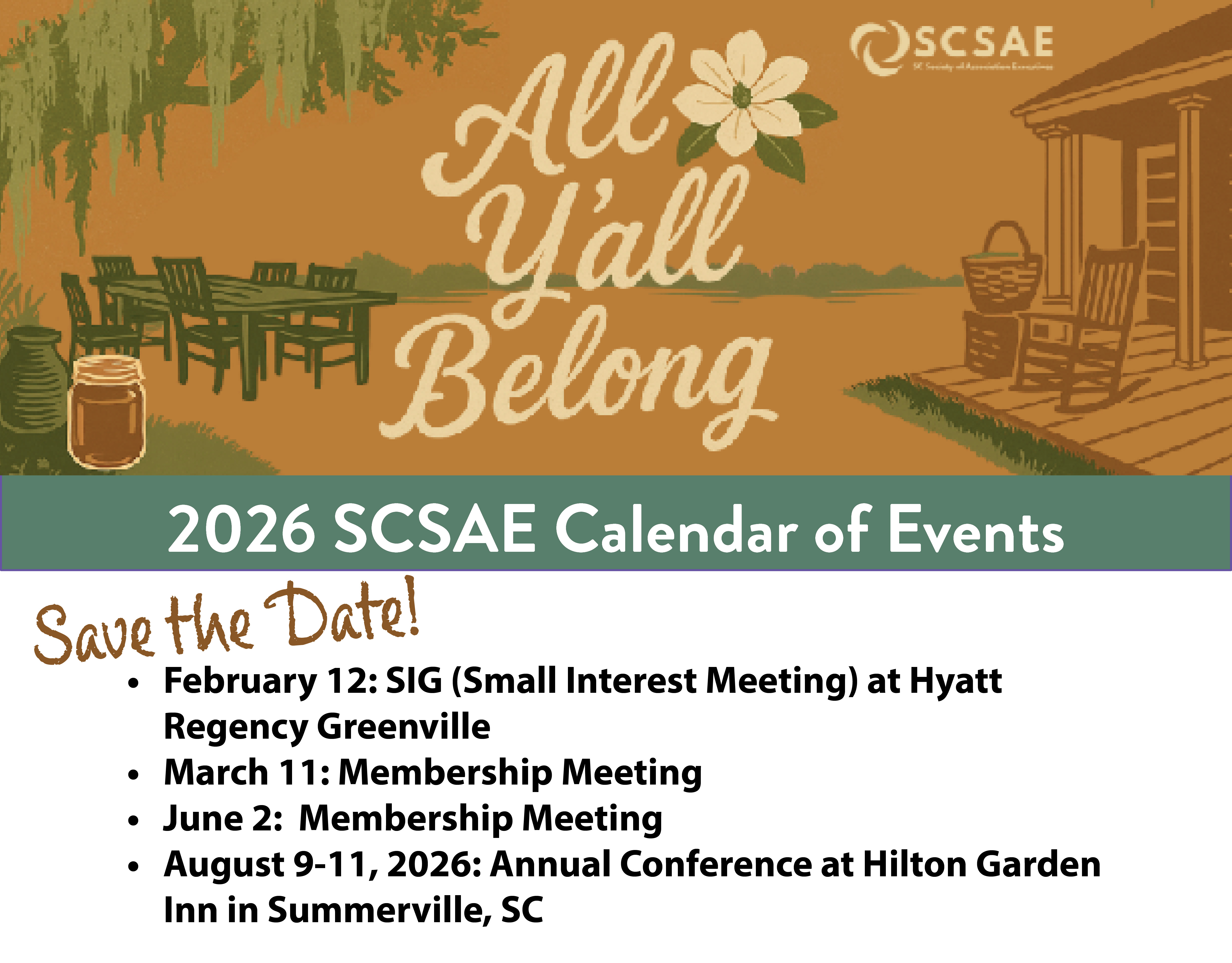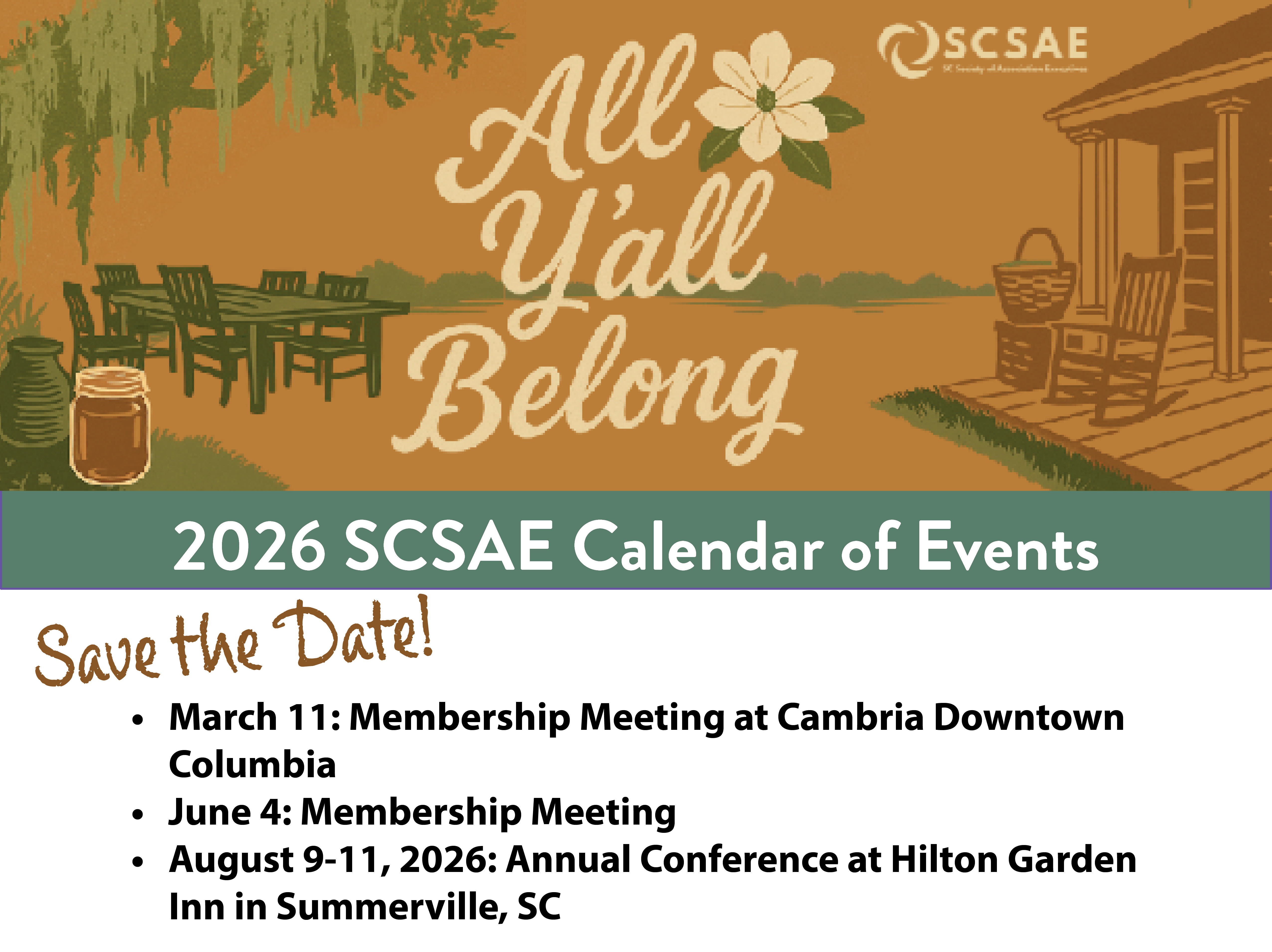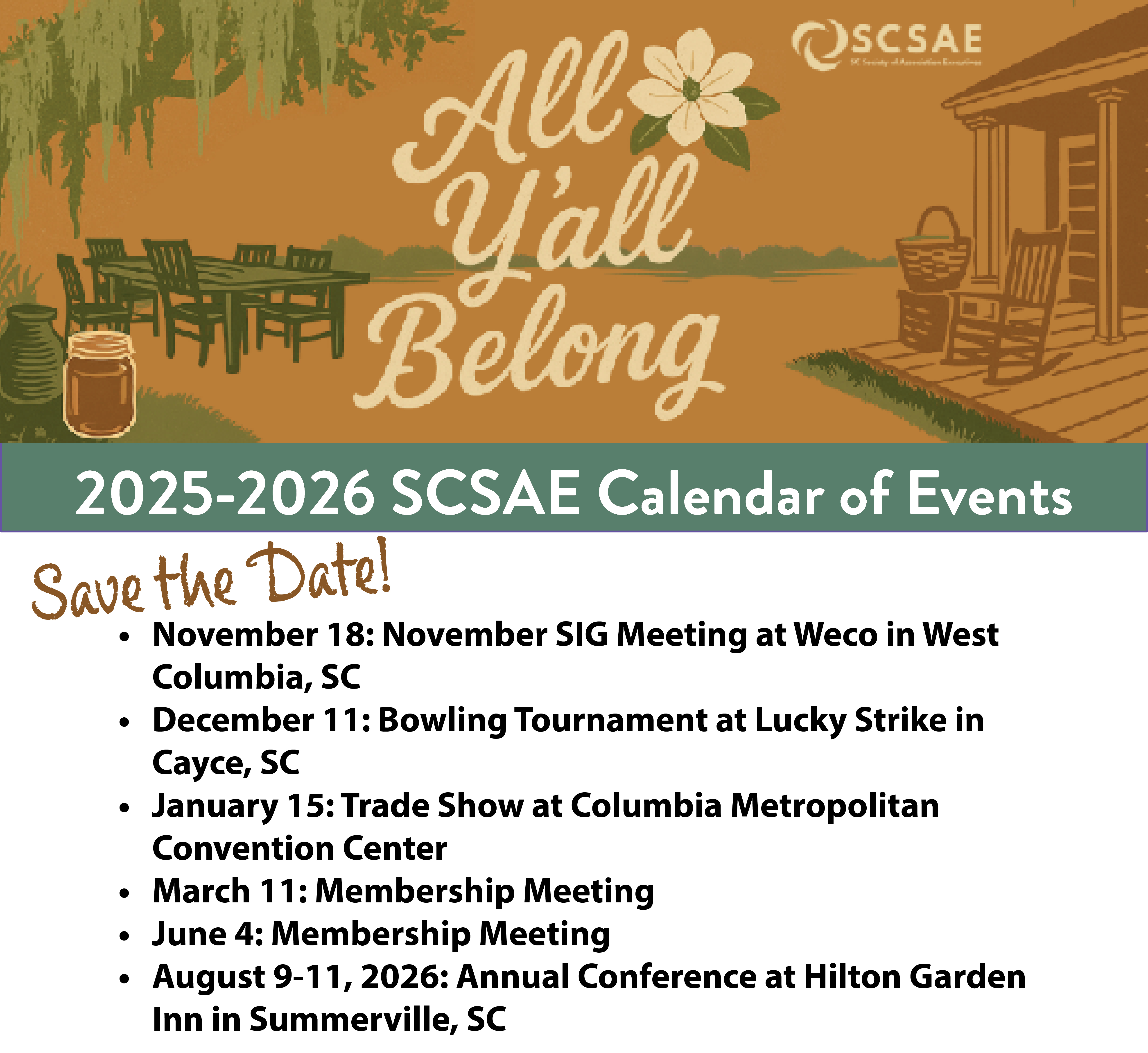 Welcome to the South Carolina Society of Association Executives website!SCSAE was formed in 1963 for chief executive officers and their professional staff: meeting planners, association staff members, and business partners to help network, build relationships within the industry, and give opportunities for educational development. SCSAE proudly has 250 members who work in the trade, professional, and non-profit association industry.