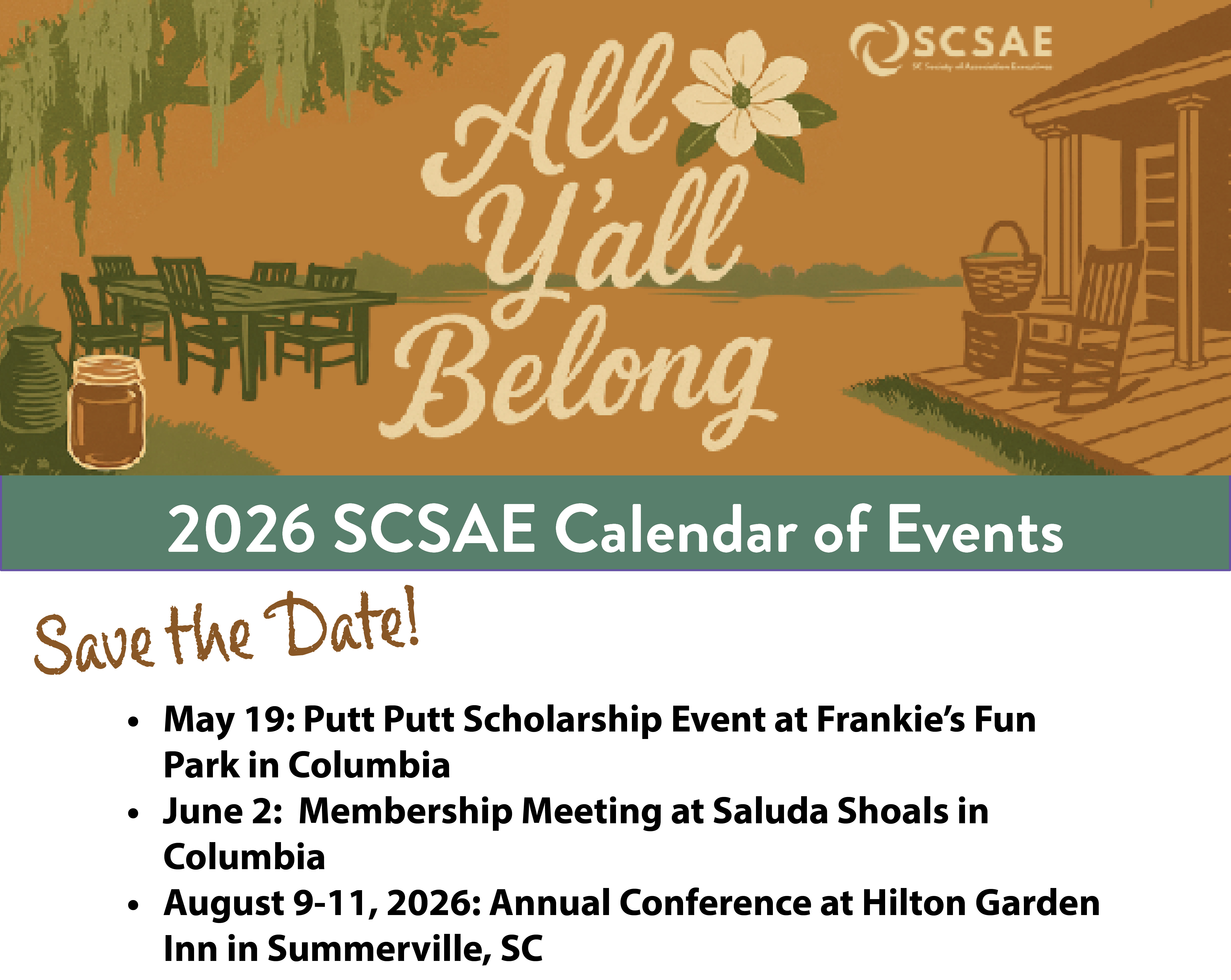 Welcome to the South Carolina Society of Association Executives website!SCSAE was formed in 1963 for chief executive officers and their professional staff: meeting planners, association staff members, and business partners to help network, build relationships within the industry, and give opportunities for educational development. SCSAE proudly has 250 members who work in the trade, professional, and non-profit association industry. Join us for the May Putt Putt Scholarship Event!